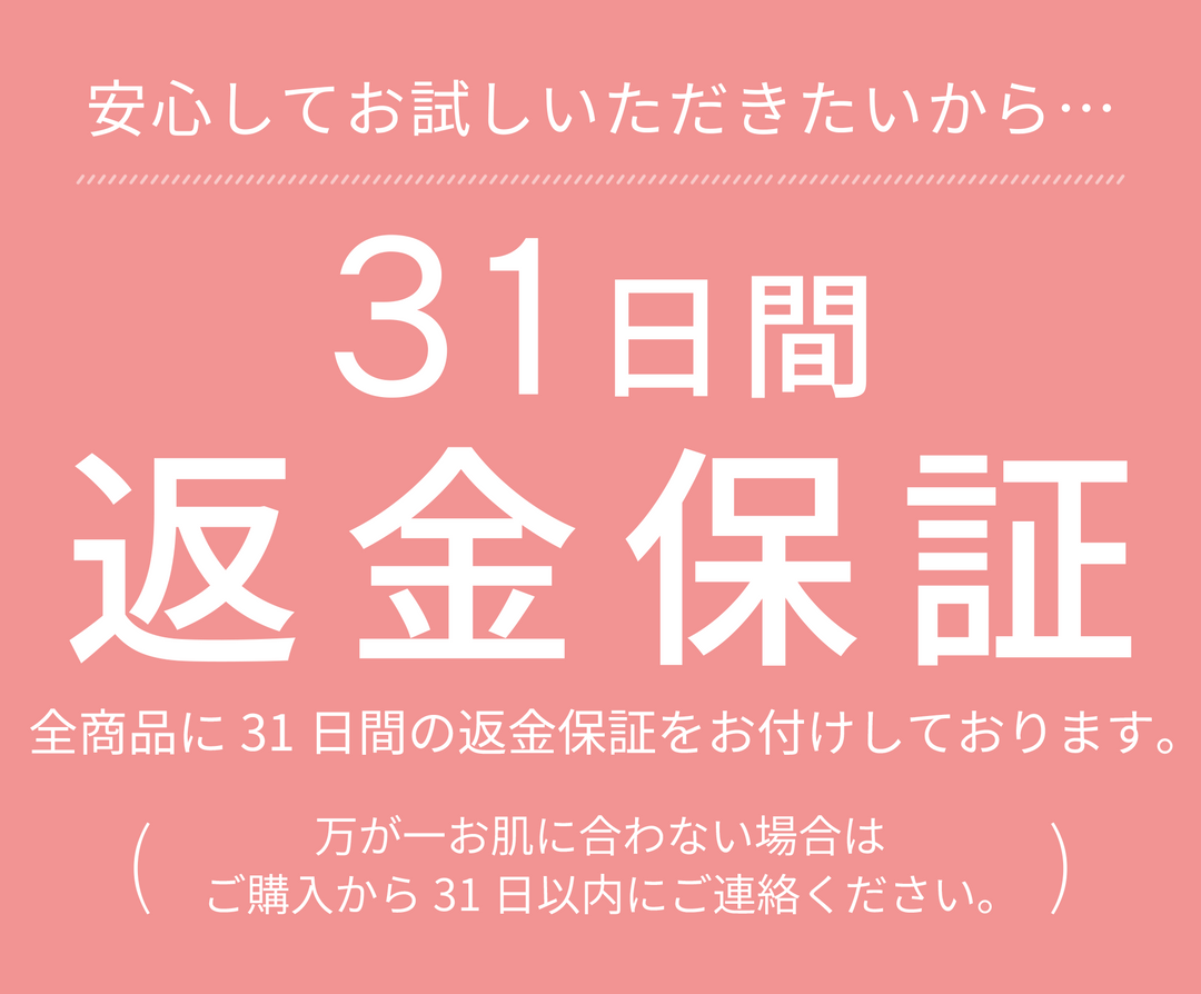 つむぎコスメでは、全商品に31日間の返金保証をお付けしております。ご使用いただき、万が一お肌に合わない場合はご購入から31日以内にご連絡ください。